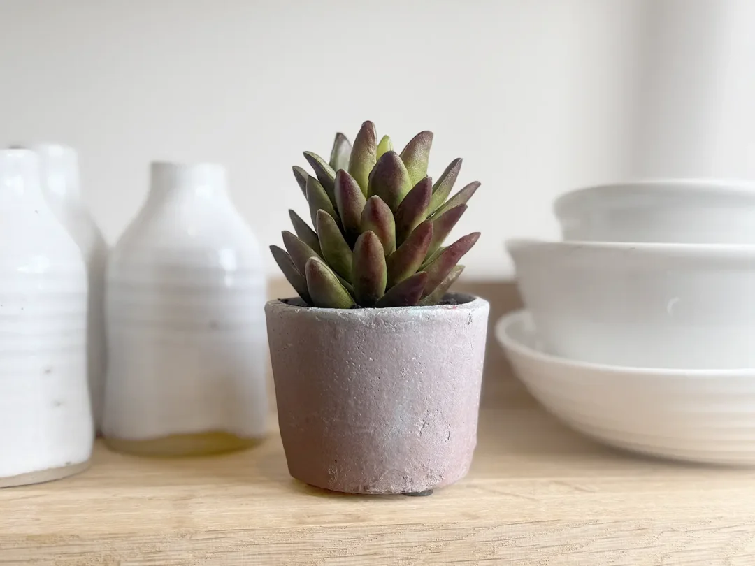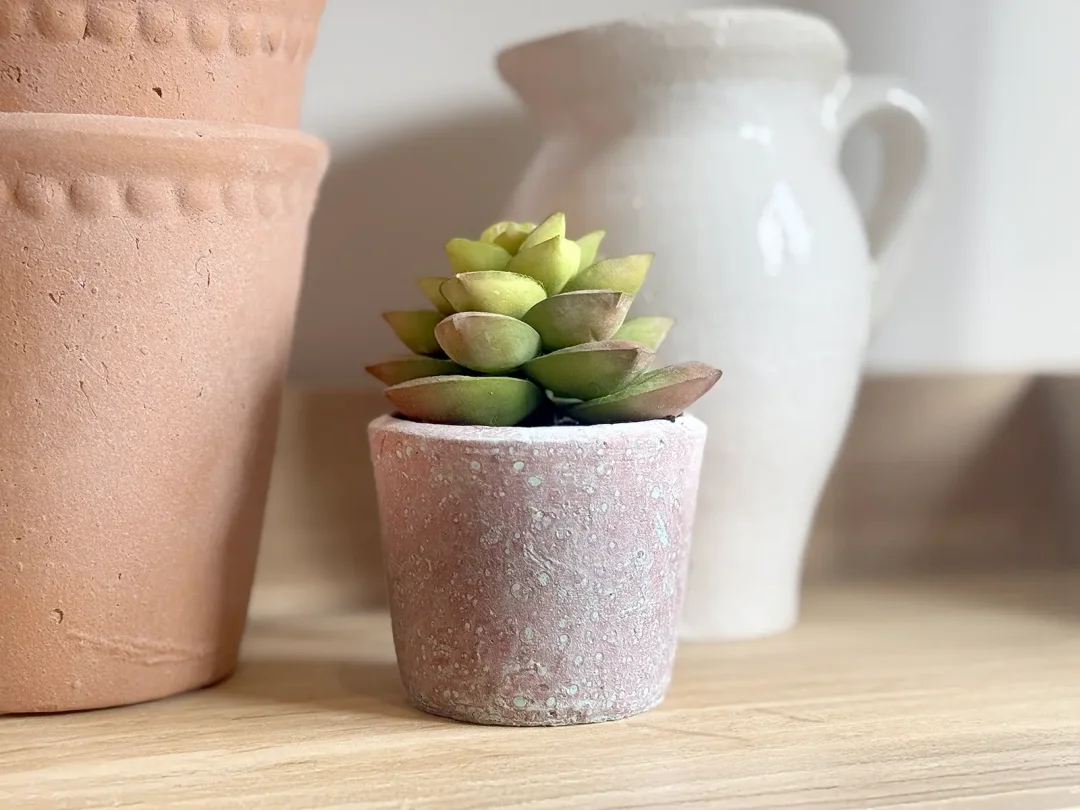 Earthy and refined, this small succulent in an aged terracotta pot features layered green and bronze leaves, offering a rustic yet contemporary look, perfect for any space.