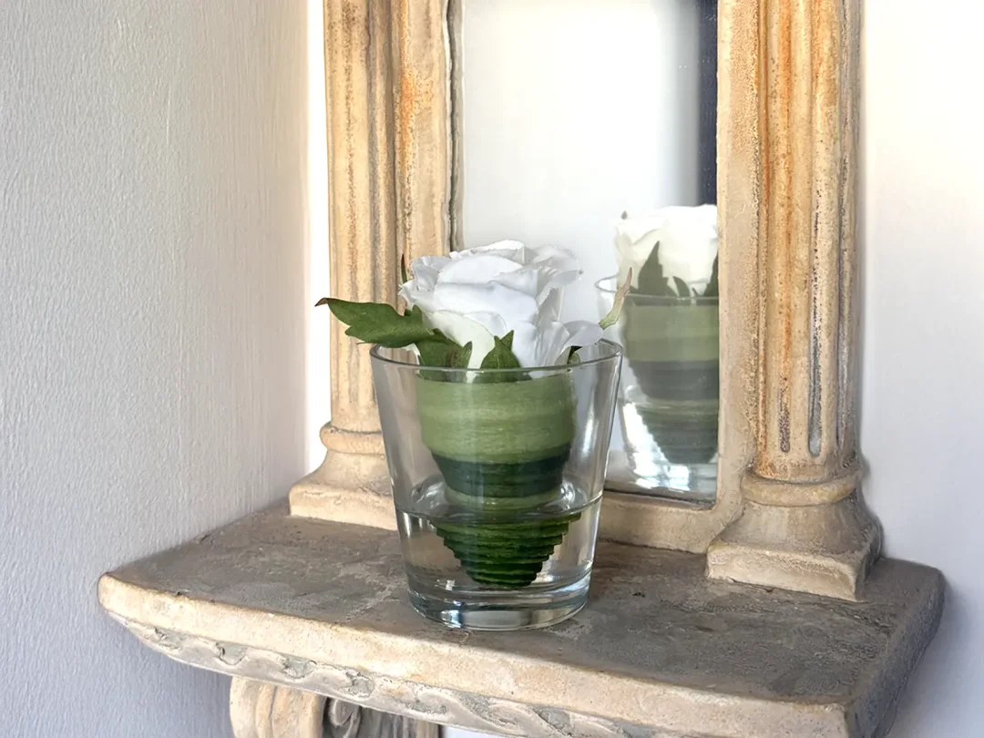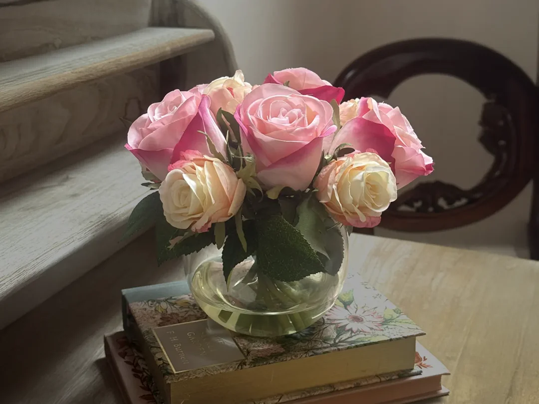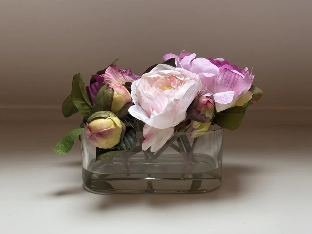Our Rose Water Collection features timeless rose arrangements in glass vessels with a water illusion, preserving their beauty. No.4 Pink showcases faux roses in a rounded vase, adding soft charm.