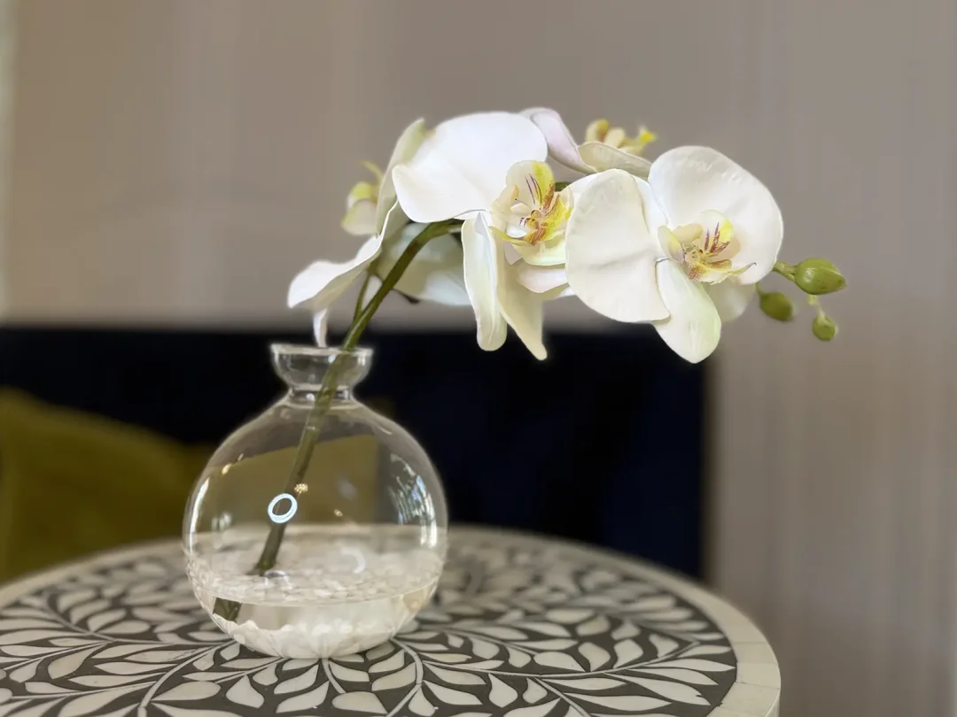 This stunning white Phalaenopsis orchid in a minimalist clear glass vase brings timeless beauty and elegance, with delicate blooms and budding green tips adding natural charm and sophistication.