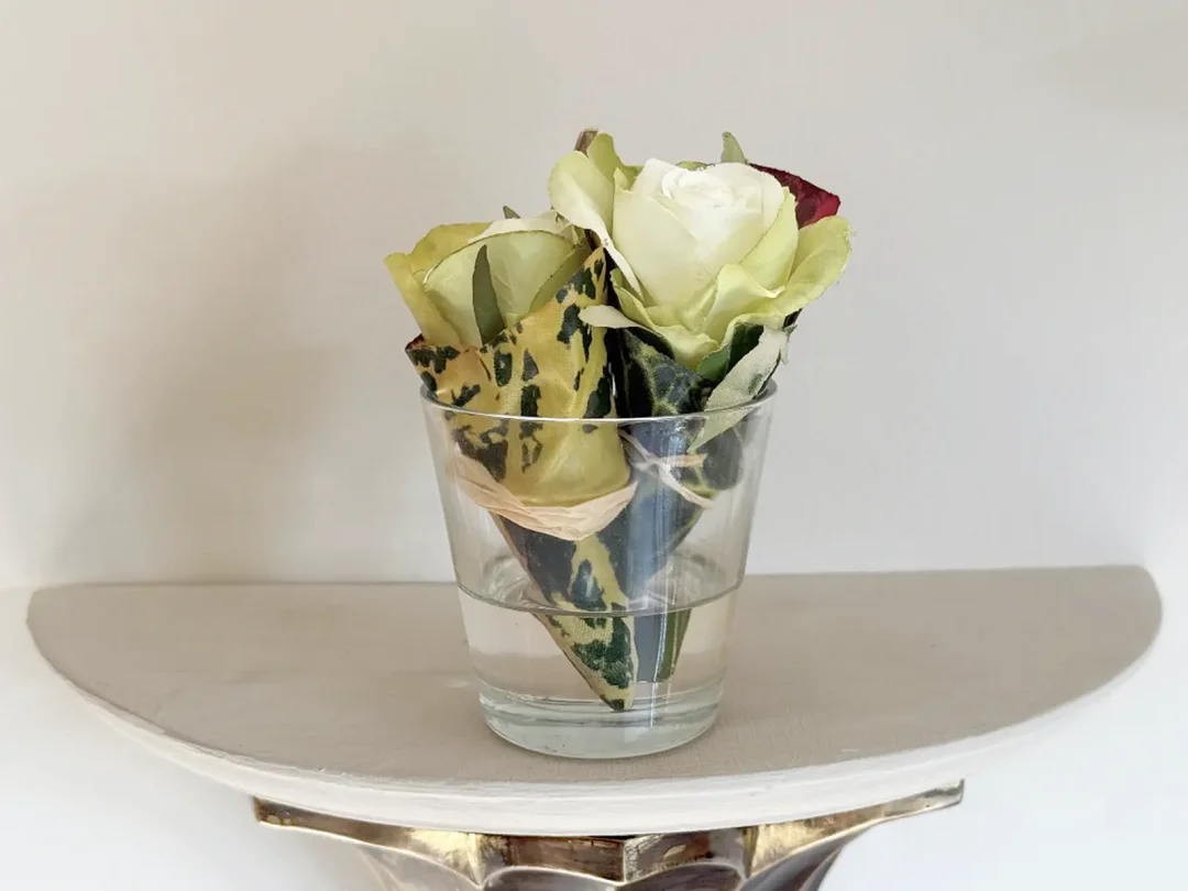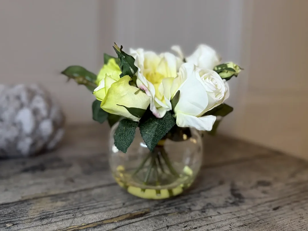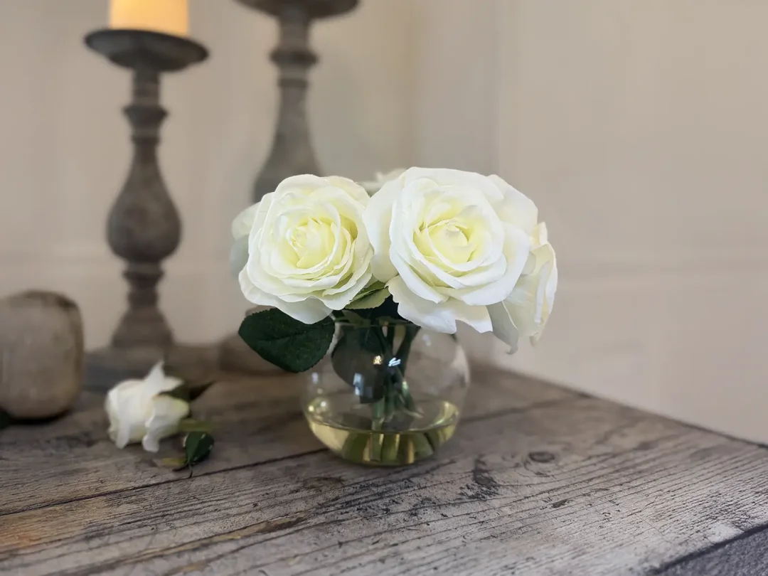 Our Rose Water Collection features timeless rose arrangements in glass vessels with a water illusion. No.3 Wild displays white faux roses in a rounded vase, offering rustic charm and elegance.