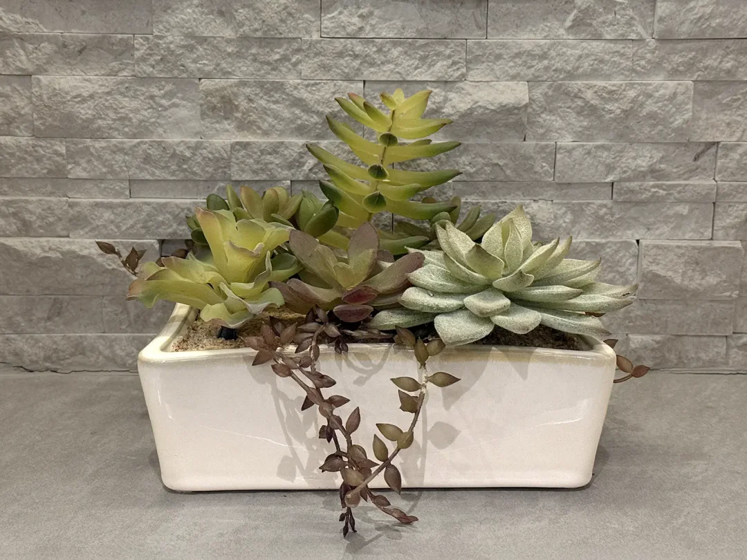 This Porcelain Succulent offers a contemporary touch with ultra-realistic succulents in soft green and plum, in a glossy white porcelain pot, requiring no care and perfect for any space.
