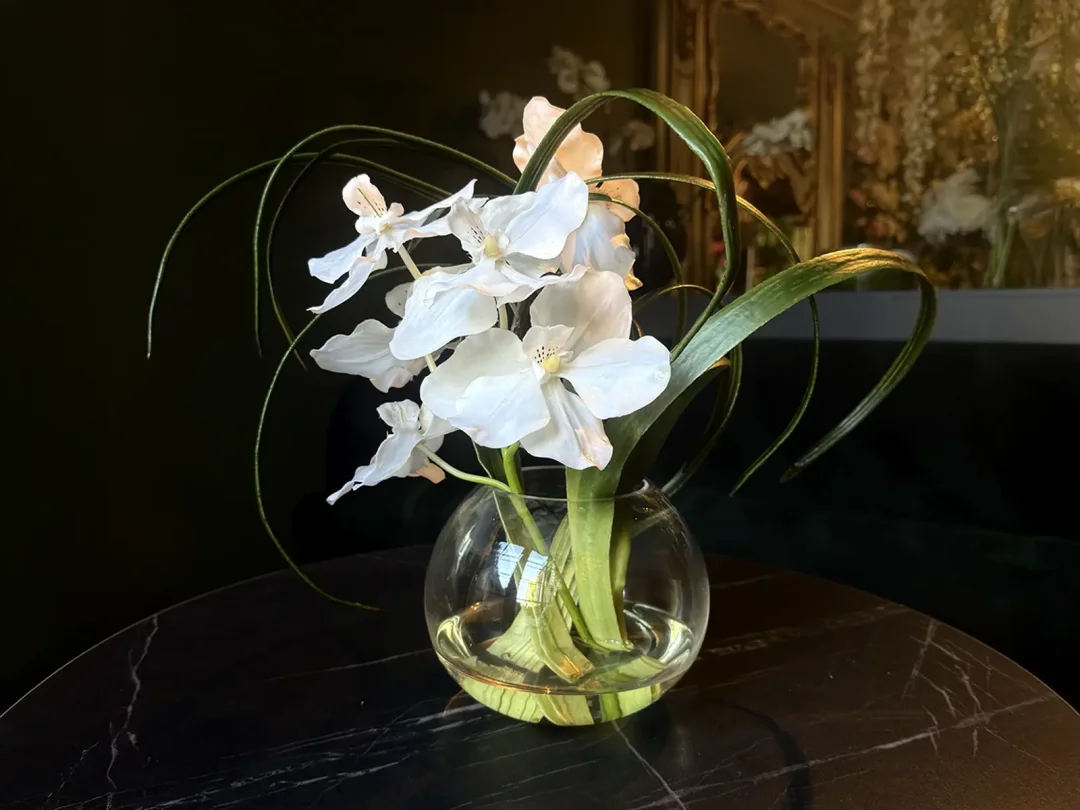 Elevate your interior with a white Vanda orchid in a clear glass vase, featuring exotic beauty, elongated leaves, and white blooms, perfect for modern spaces, offering balance and tranquillity.
